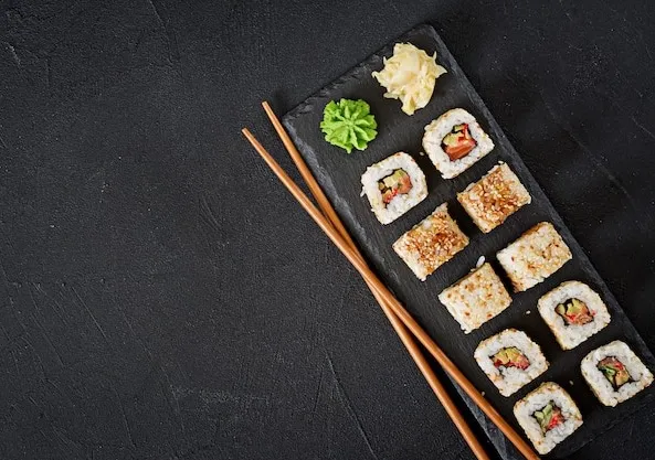 14.90€riz vinaigné,carotte ,wakame,concombre,mangue,mais,avocat,sesame,oignon frit